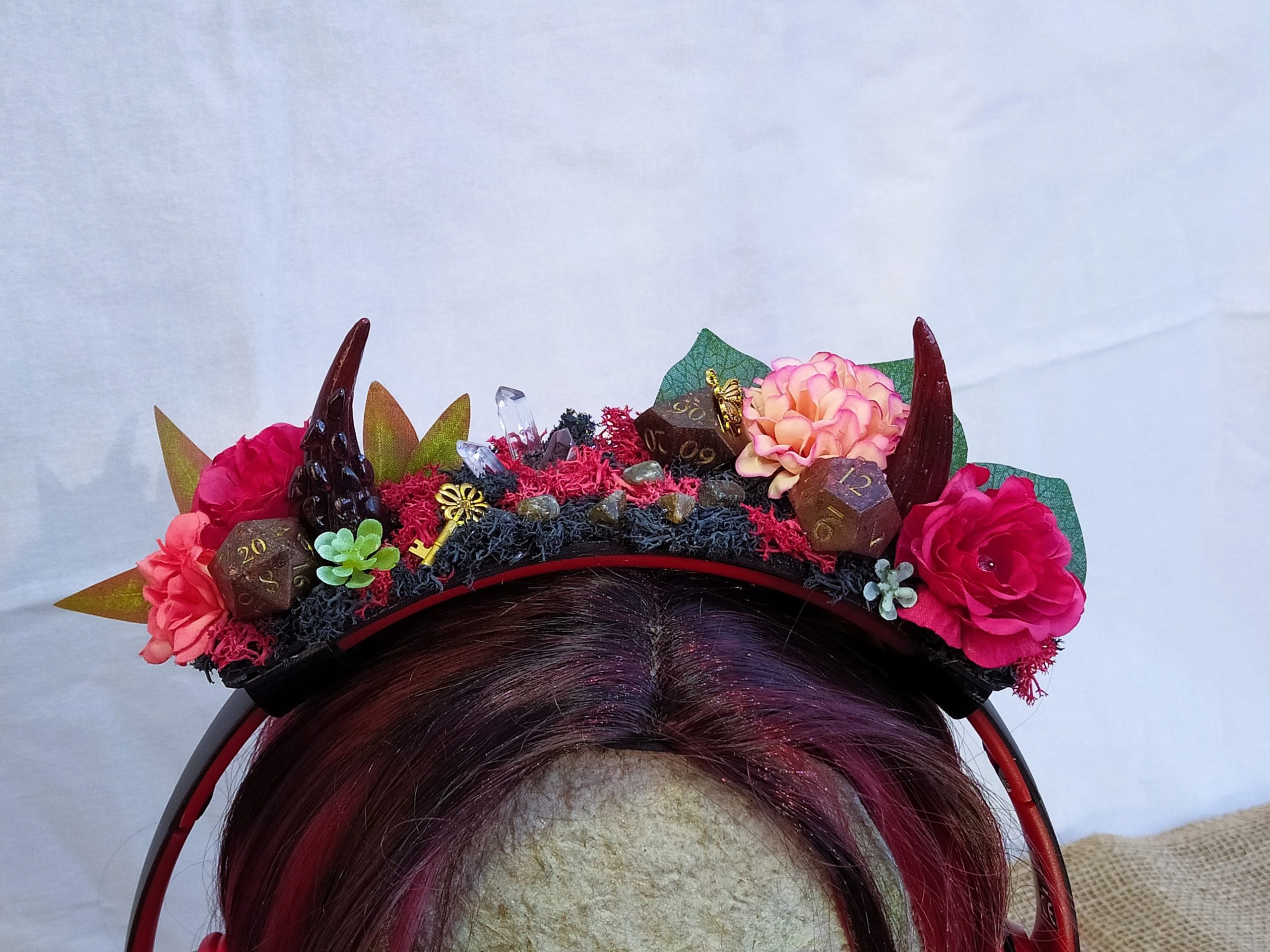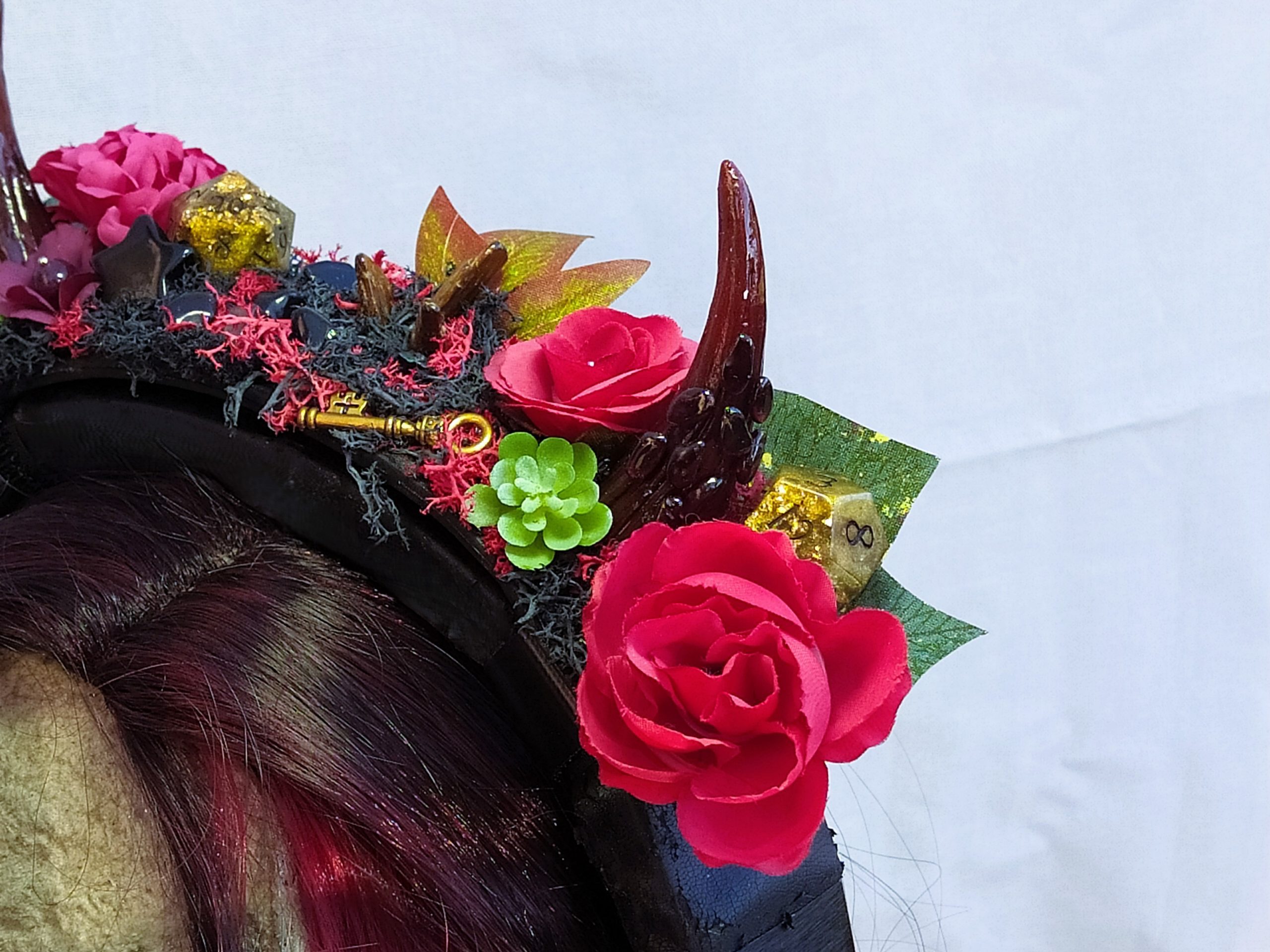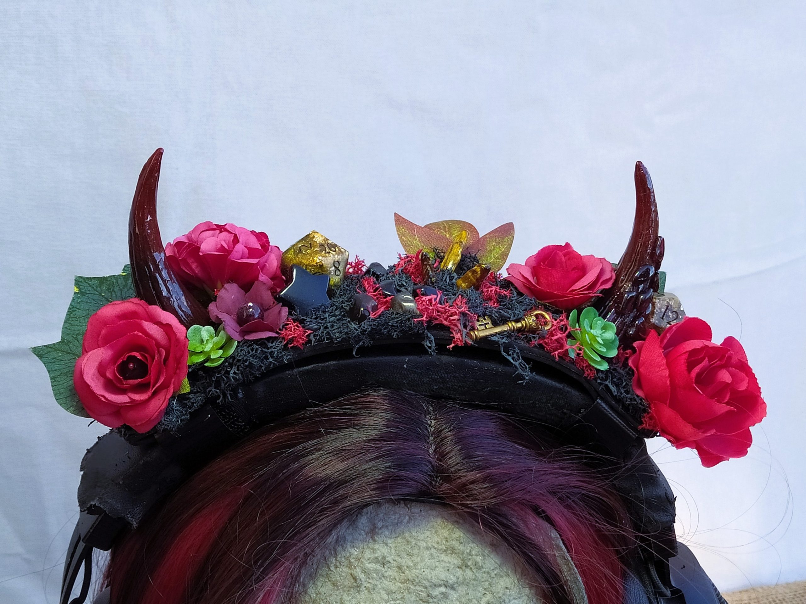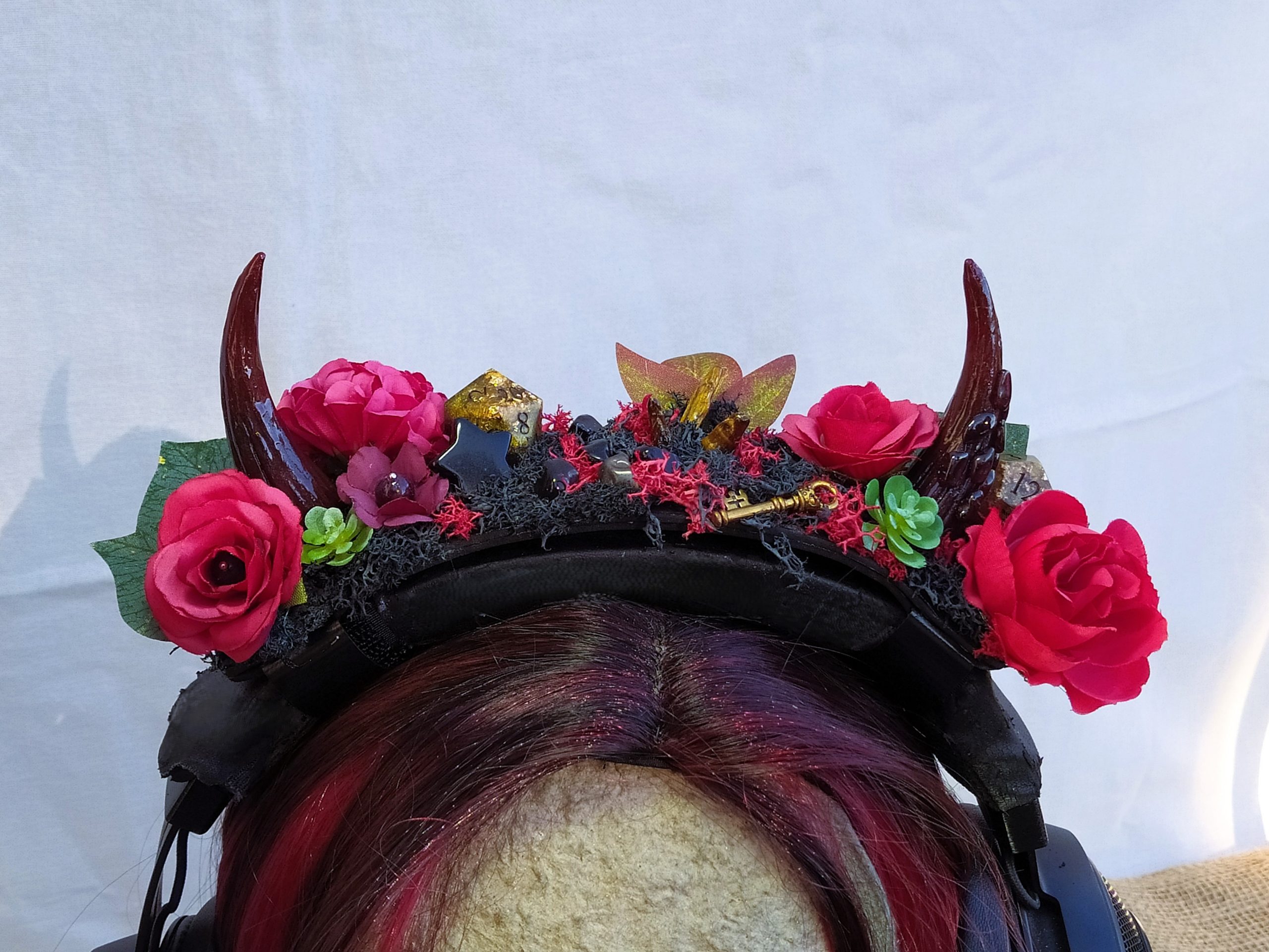 Jolie Succube – Décoration de Casque Gaming/Audio – Cornes de Démon Fleuries, Résine, Mousse et Pierre Naturelles
