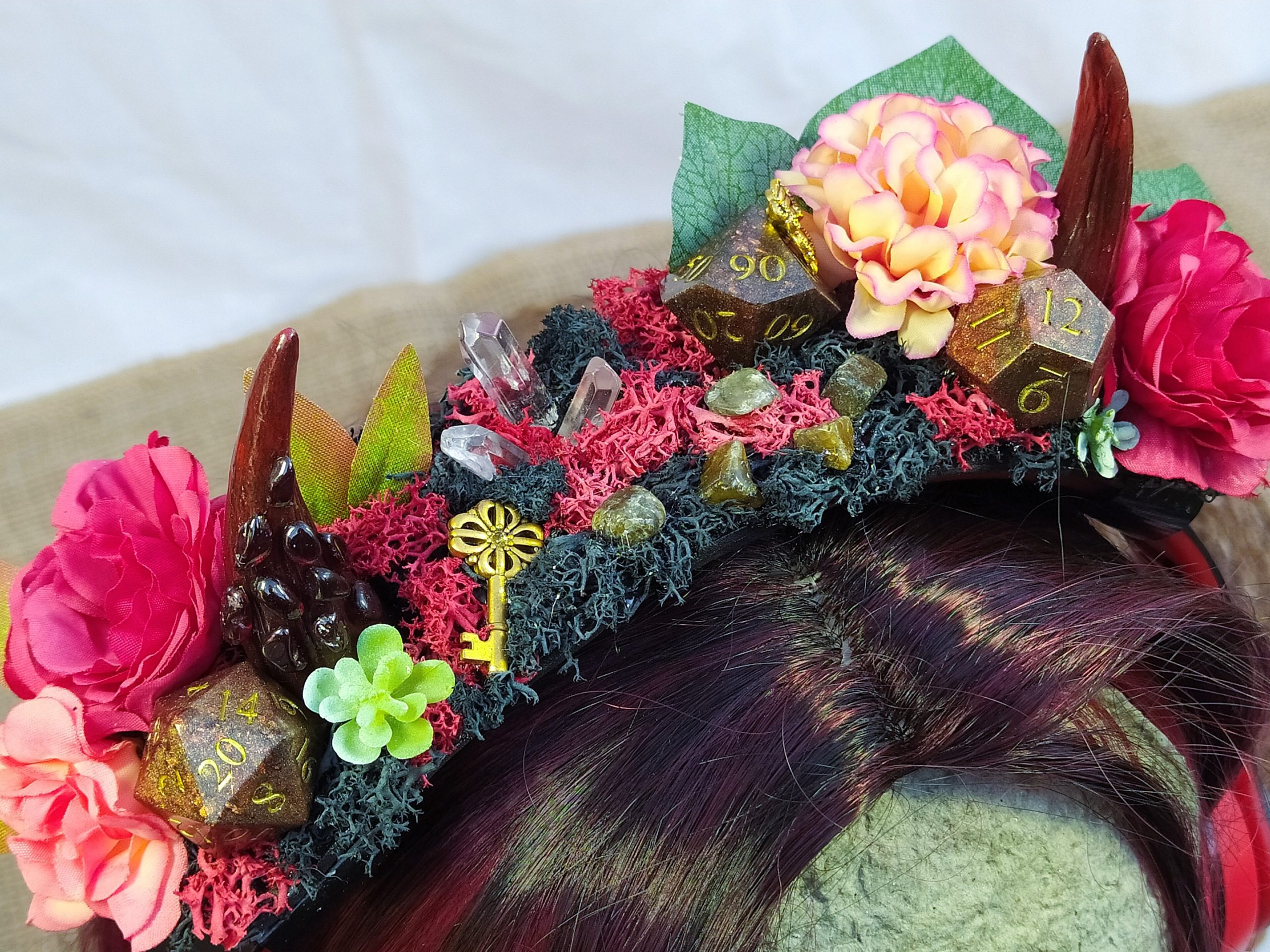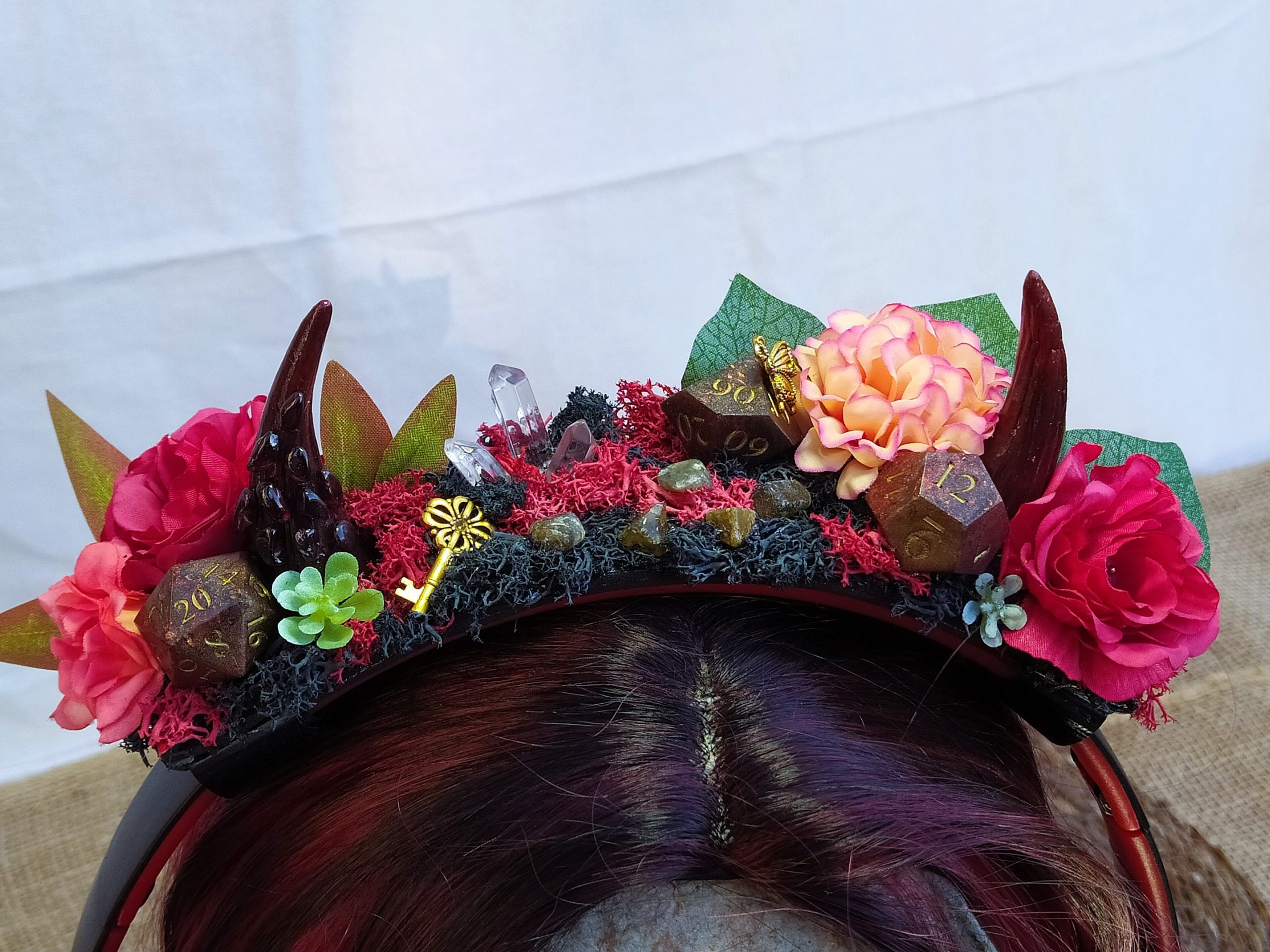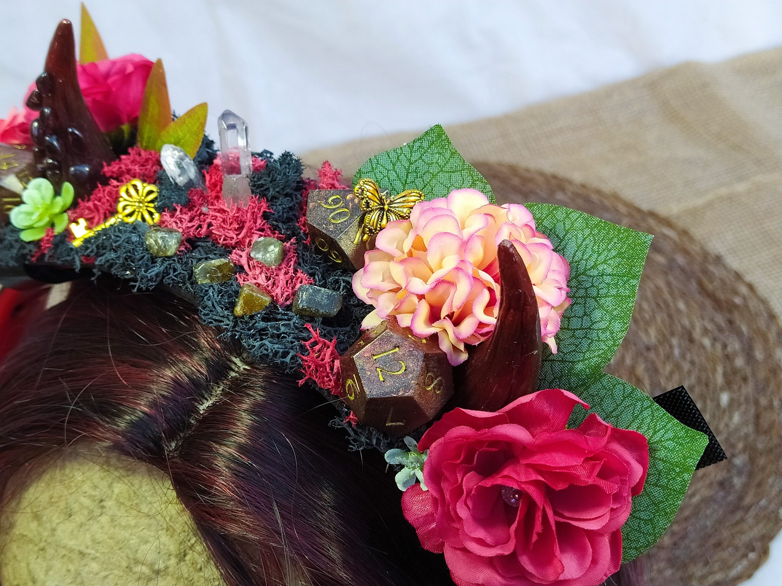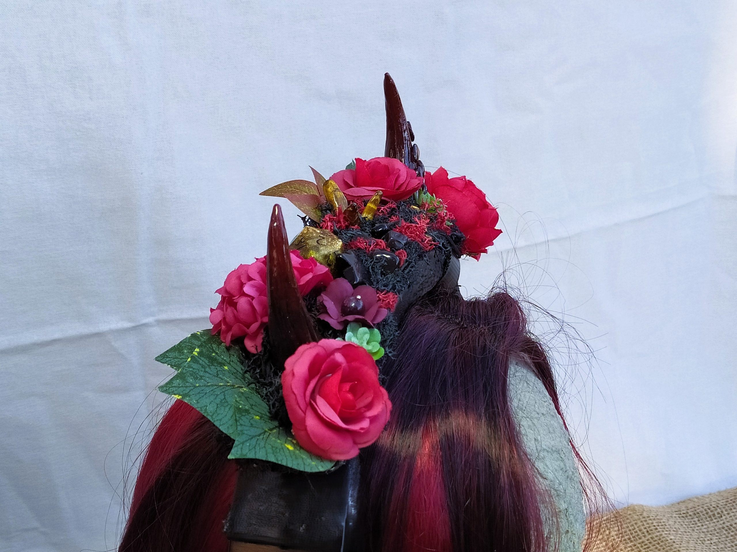 Jolie Succube – Décoration de Casque Gaming/Audio – Cornes de Démon Fleuries, Résine, Mousse et Pierre Naturelles