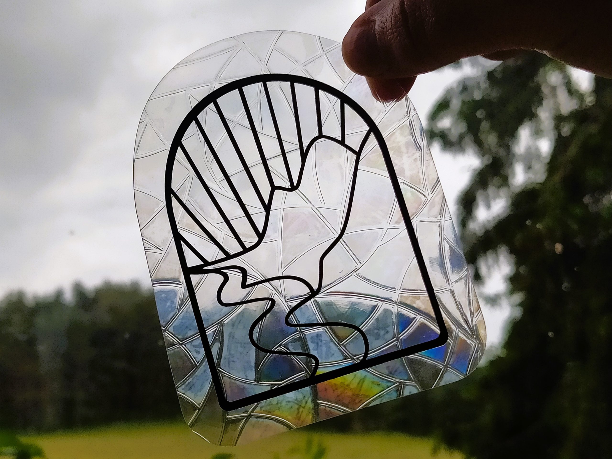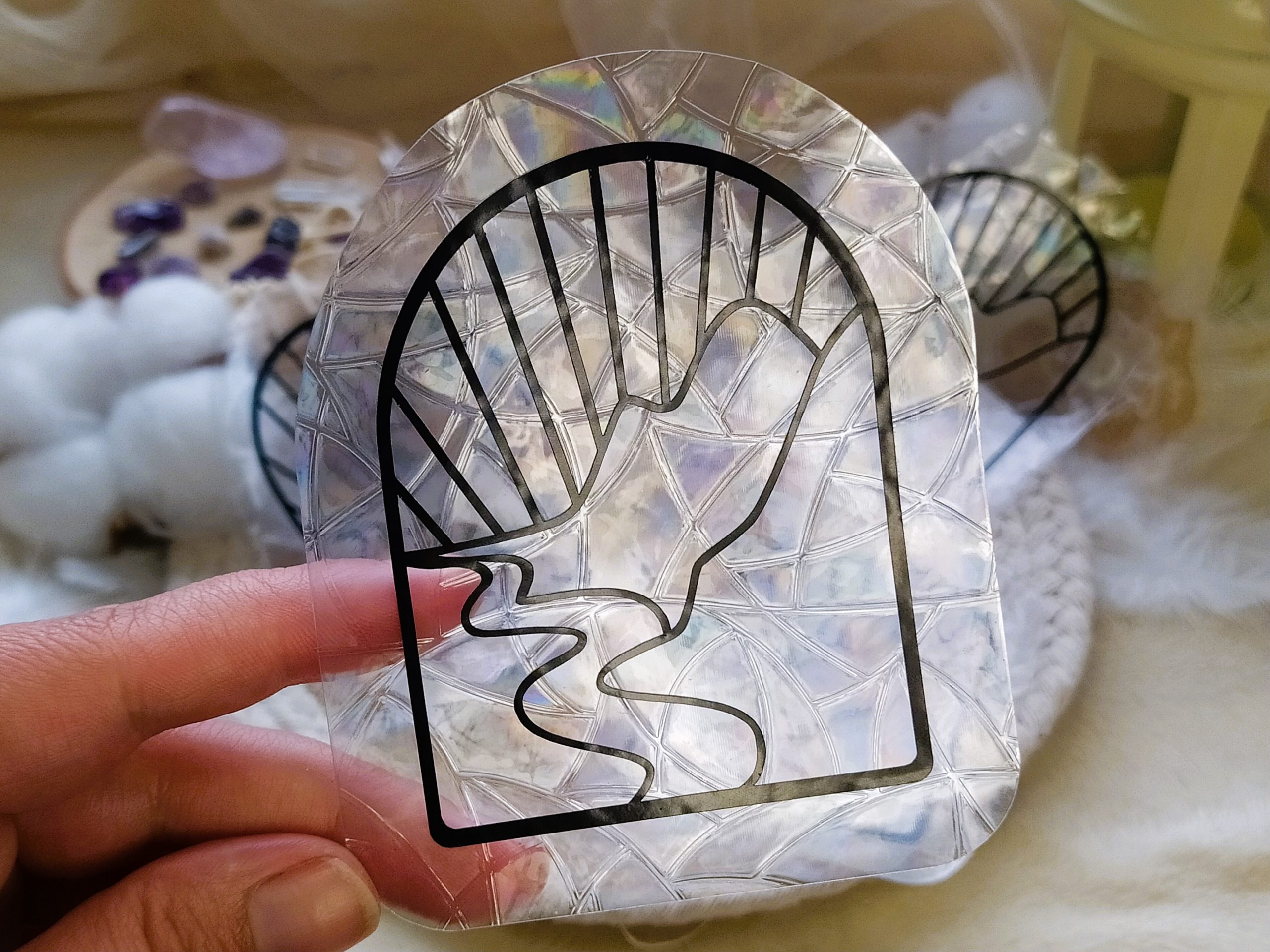 Cette création se compose d’un fond en vinyle semi-transparent aux reflets holographiques, conçu pour capter la lumière et diffuser de jolis reflets arc-en-ciel lorsque les rayons du soleil le traversent