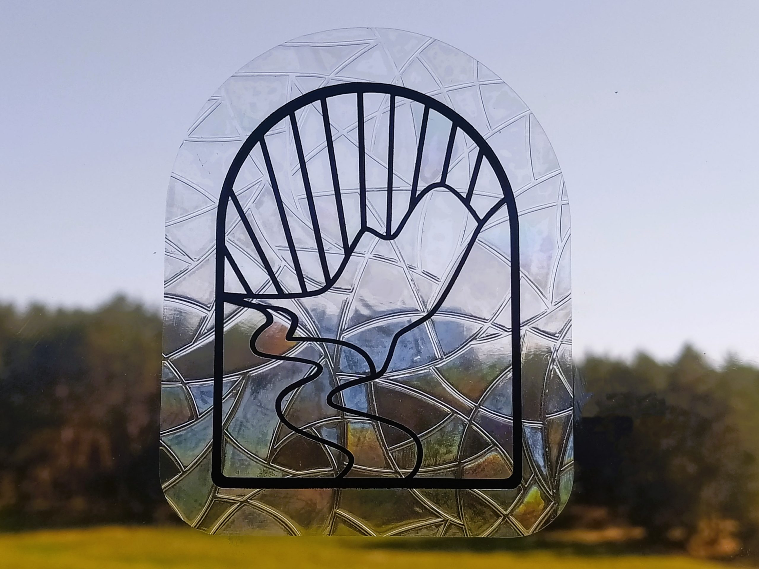 Ce contraste entre le noir profond du dessin et la transparence holographique crée un effet graphique élégant et minimaliste, mettant en valeur les lignes du paysage