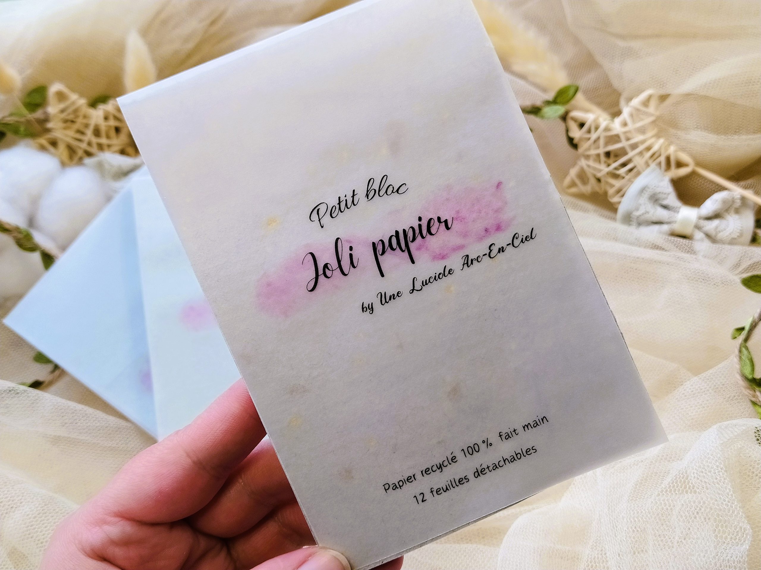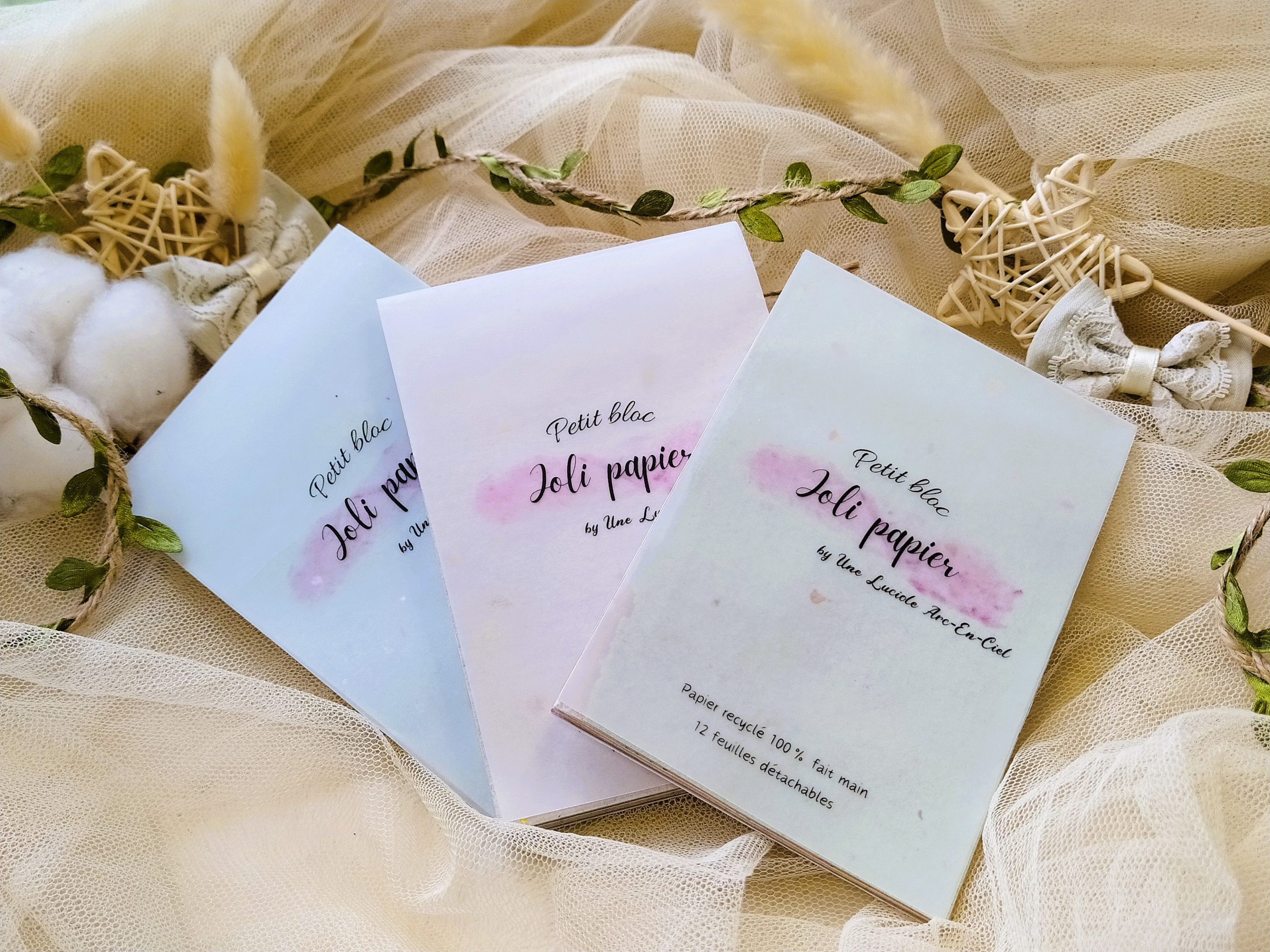 Possibilité de concevoir du papier recyclé entièrement personnalisé selon tes envies (couleurs, format, épaisseur, incrustations, etc…), il suffit simplement de m’envoyer un petit message via mon formulaire de contact ou sur ma messagerie Instagram