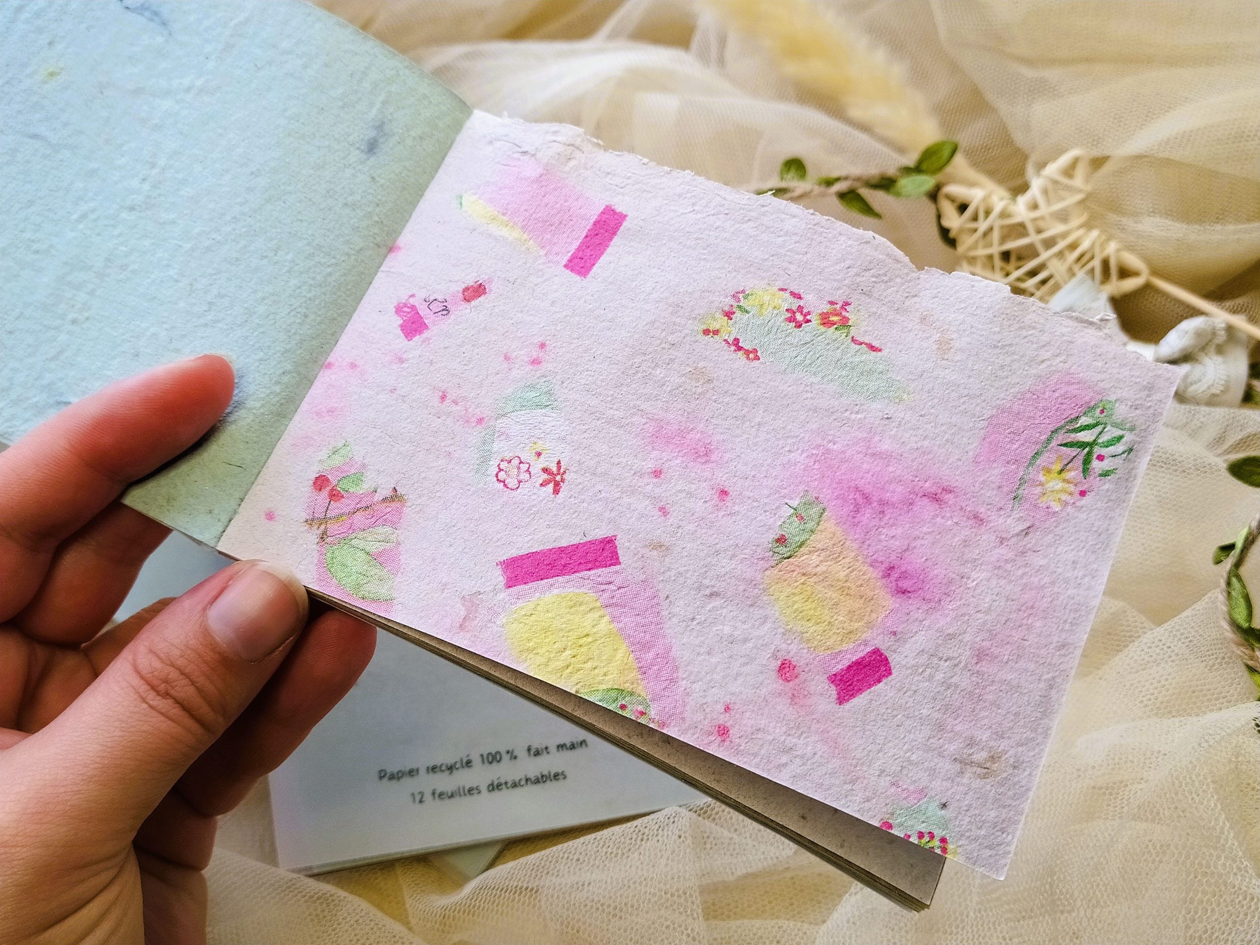 Il contient 12 feuilles détachables de papier recyclé, toutes différentes, réalisées à la main à partir des chutes issues de mes autres créations de papeterie (stickers, bloc-notes, tests ou défauts d’impression, etc…)