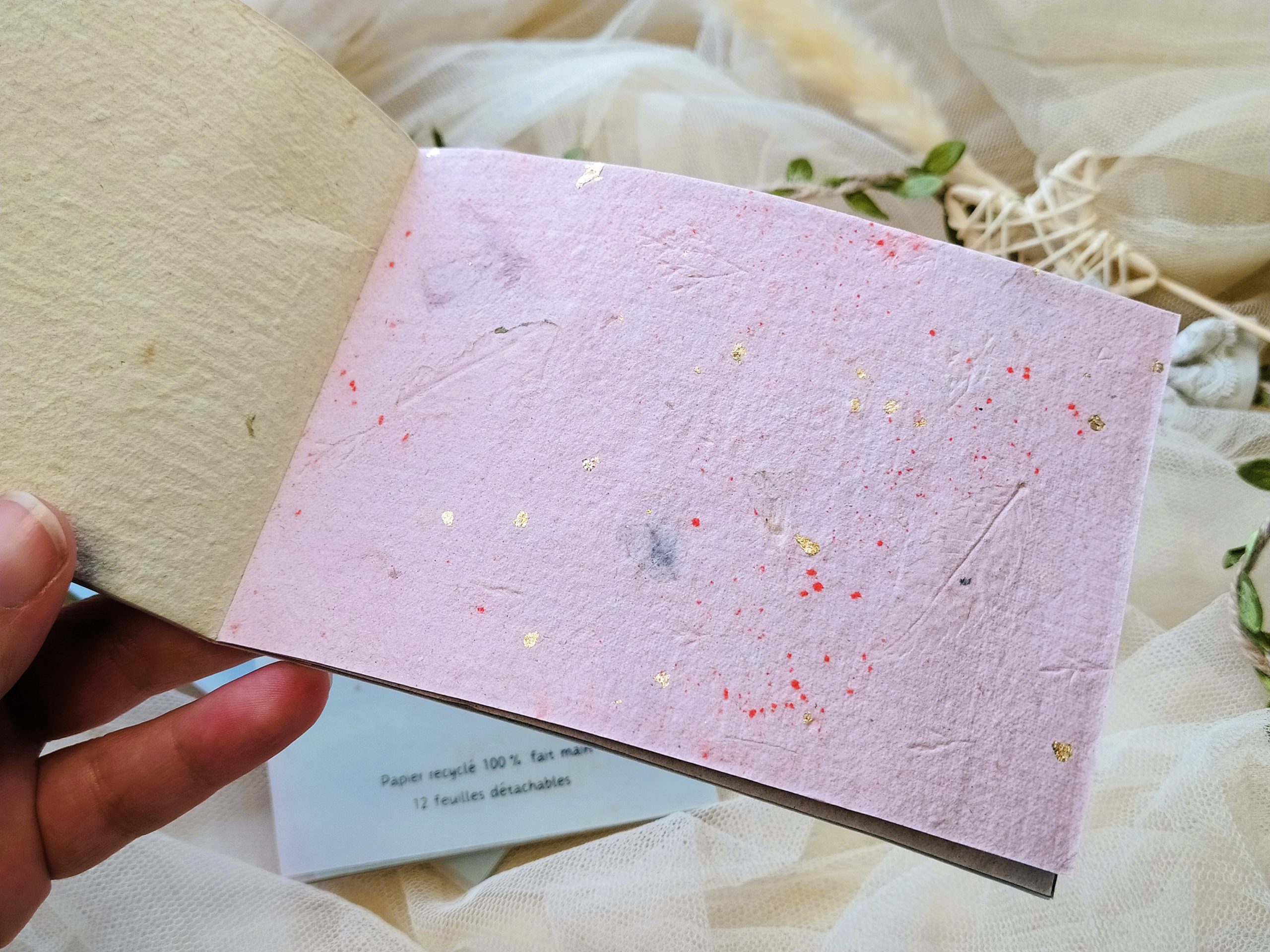 Textures, couleurs, incrustations et grammages varient d’un feuillet à l’autre, faisant de chaque bloc une pièce totalement unique