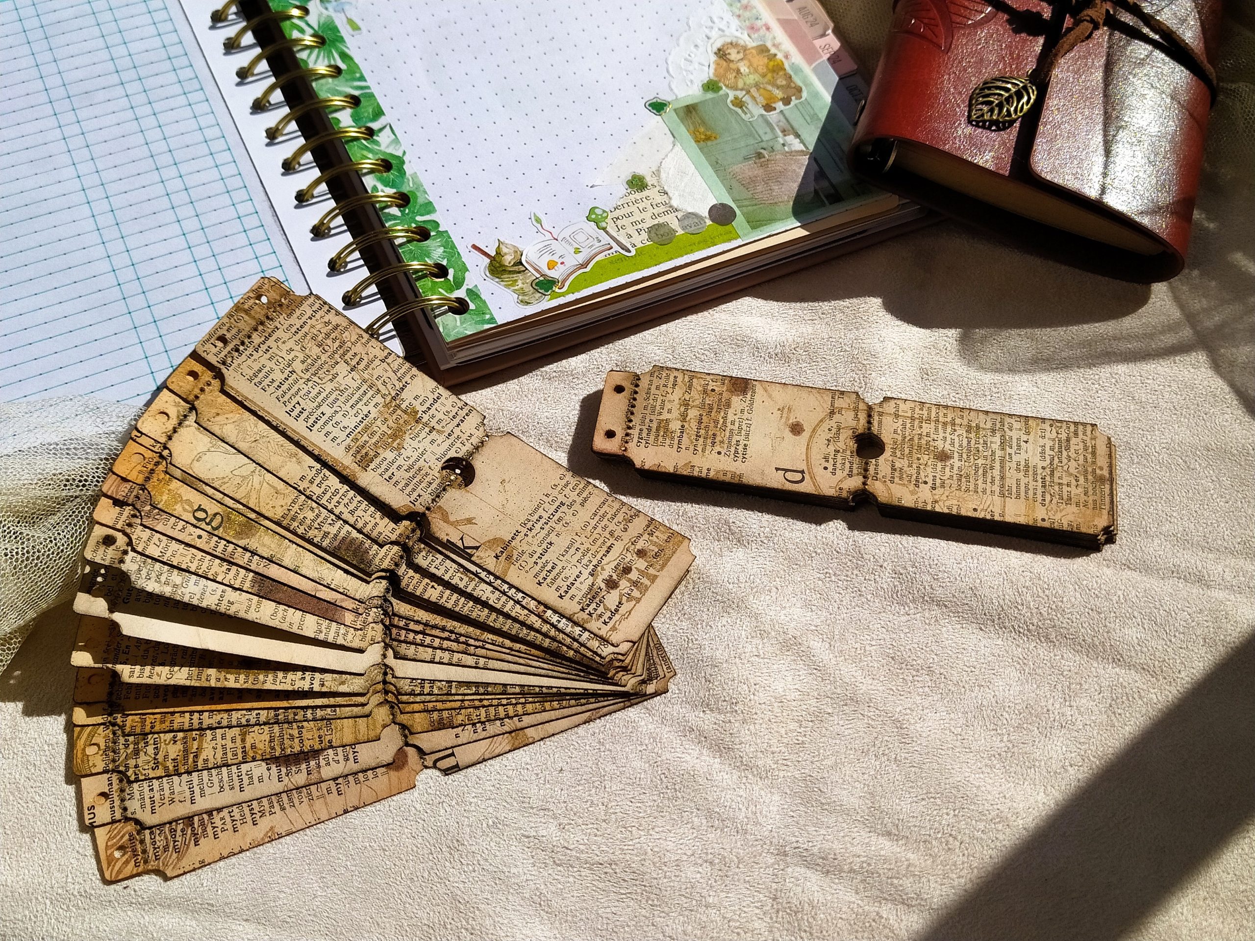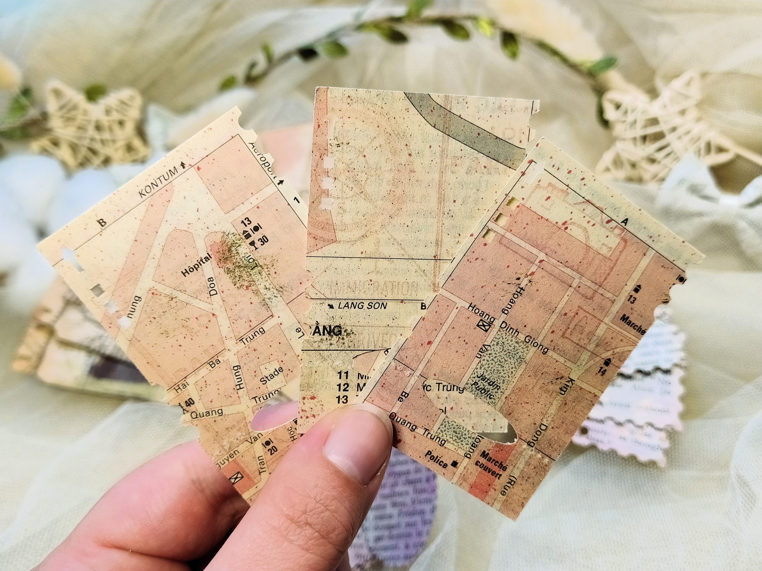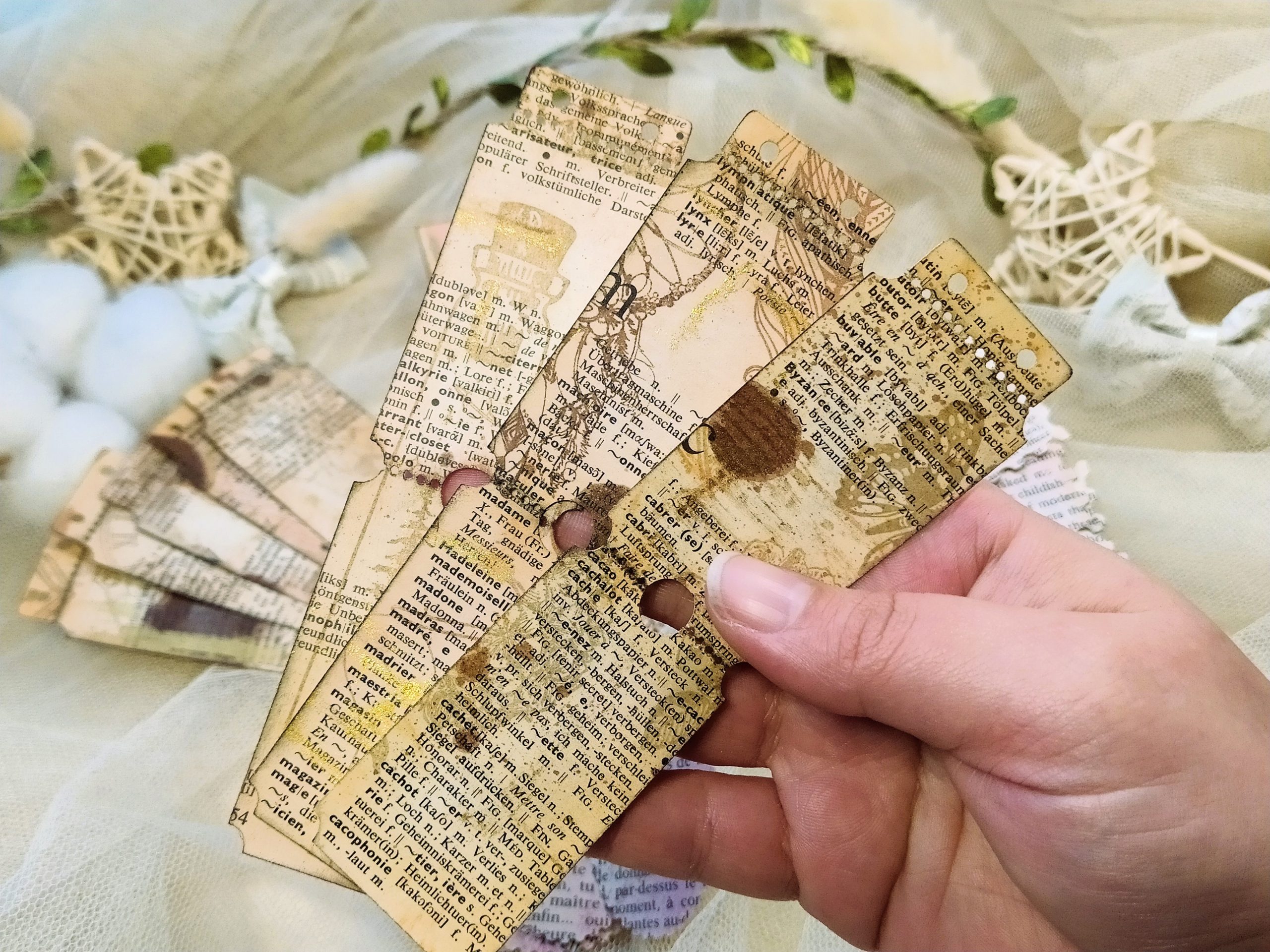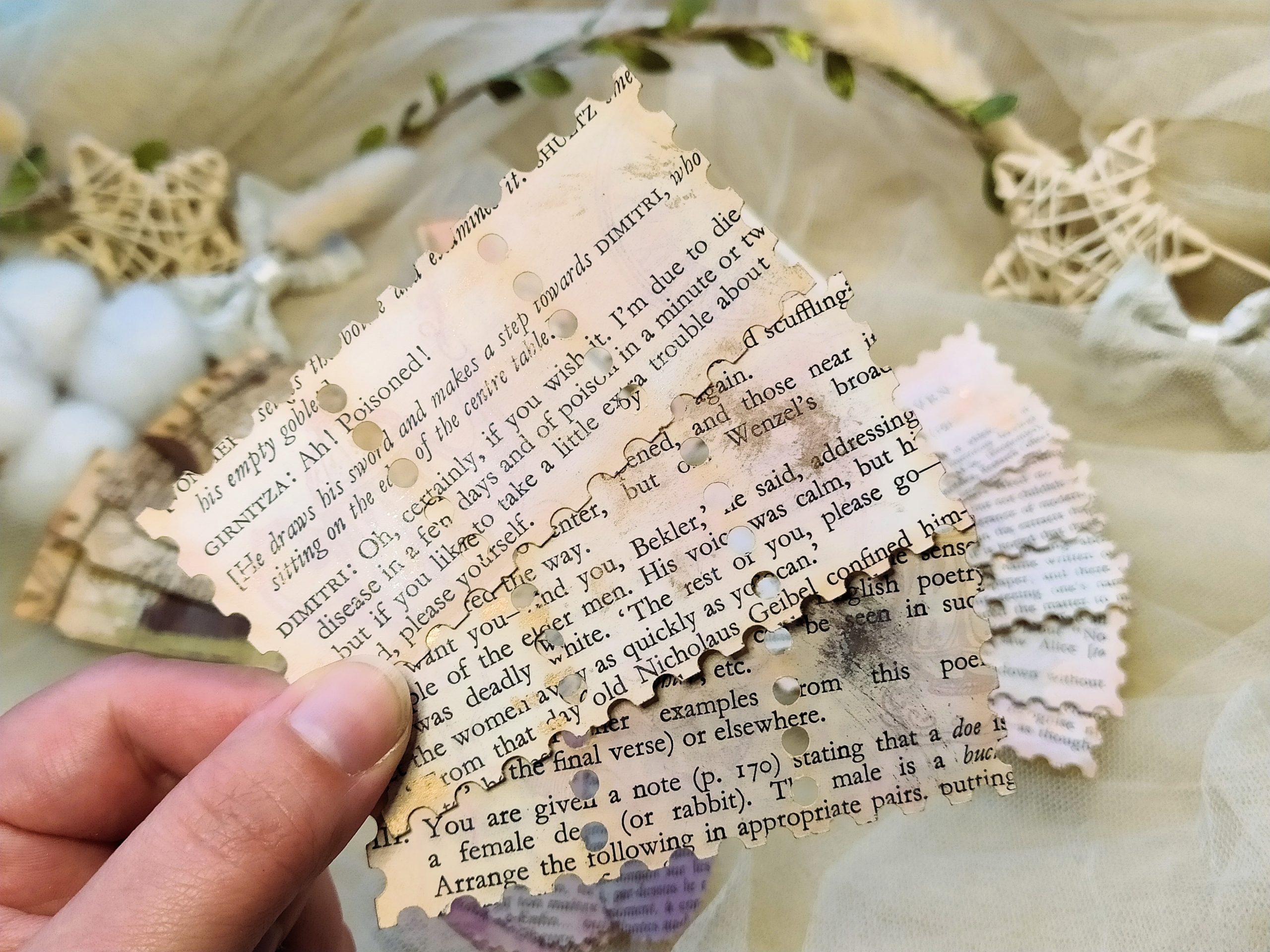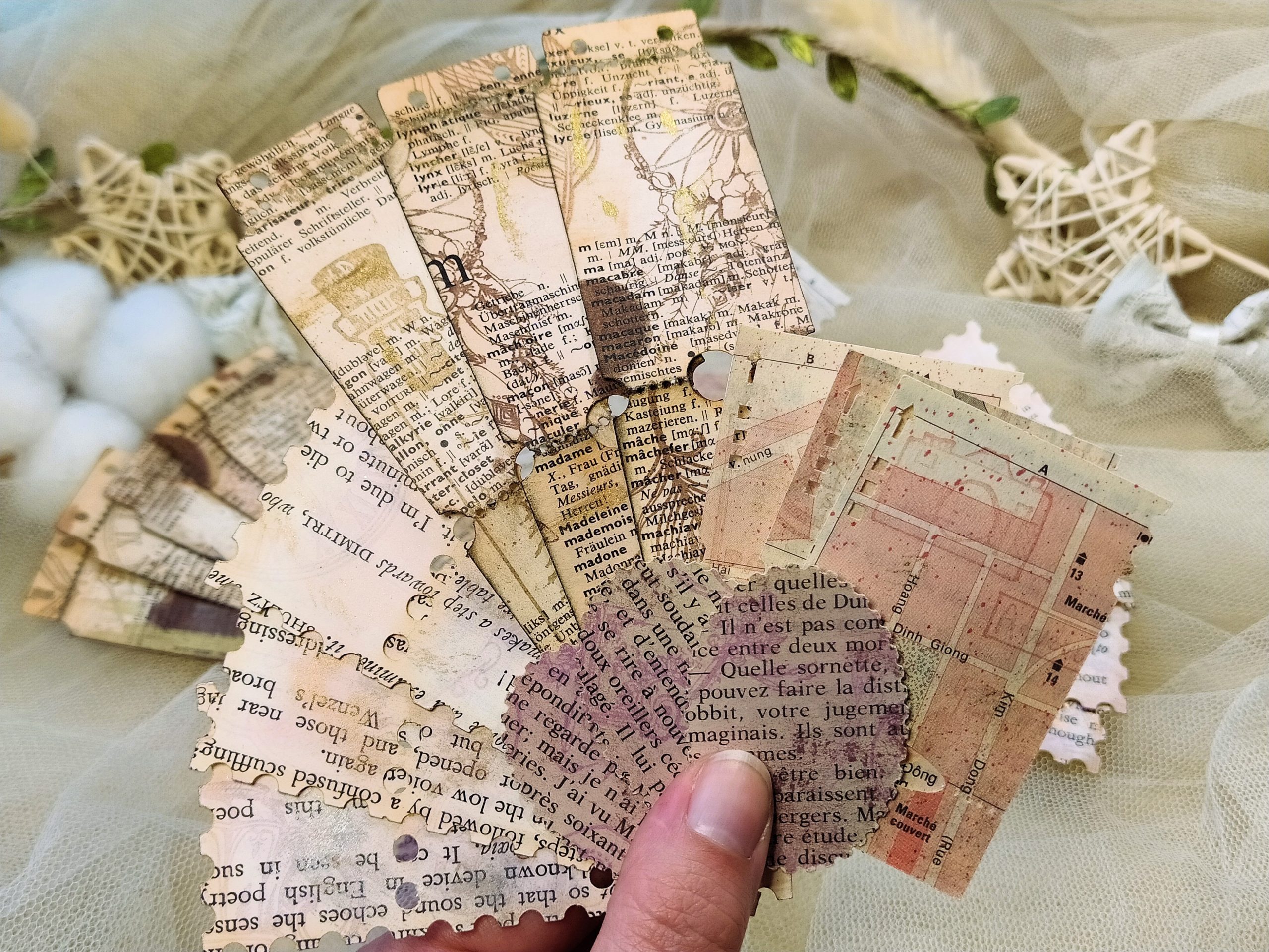 Chaque lot contient 15 stickers flakes réalisés à la main à partir de véritables pages de livres ou de documents destinés à être jeté, soigneusement sélectionnés pour être upcyclés et transformés en jolis autocollants vintage :
