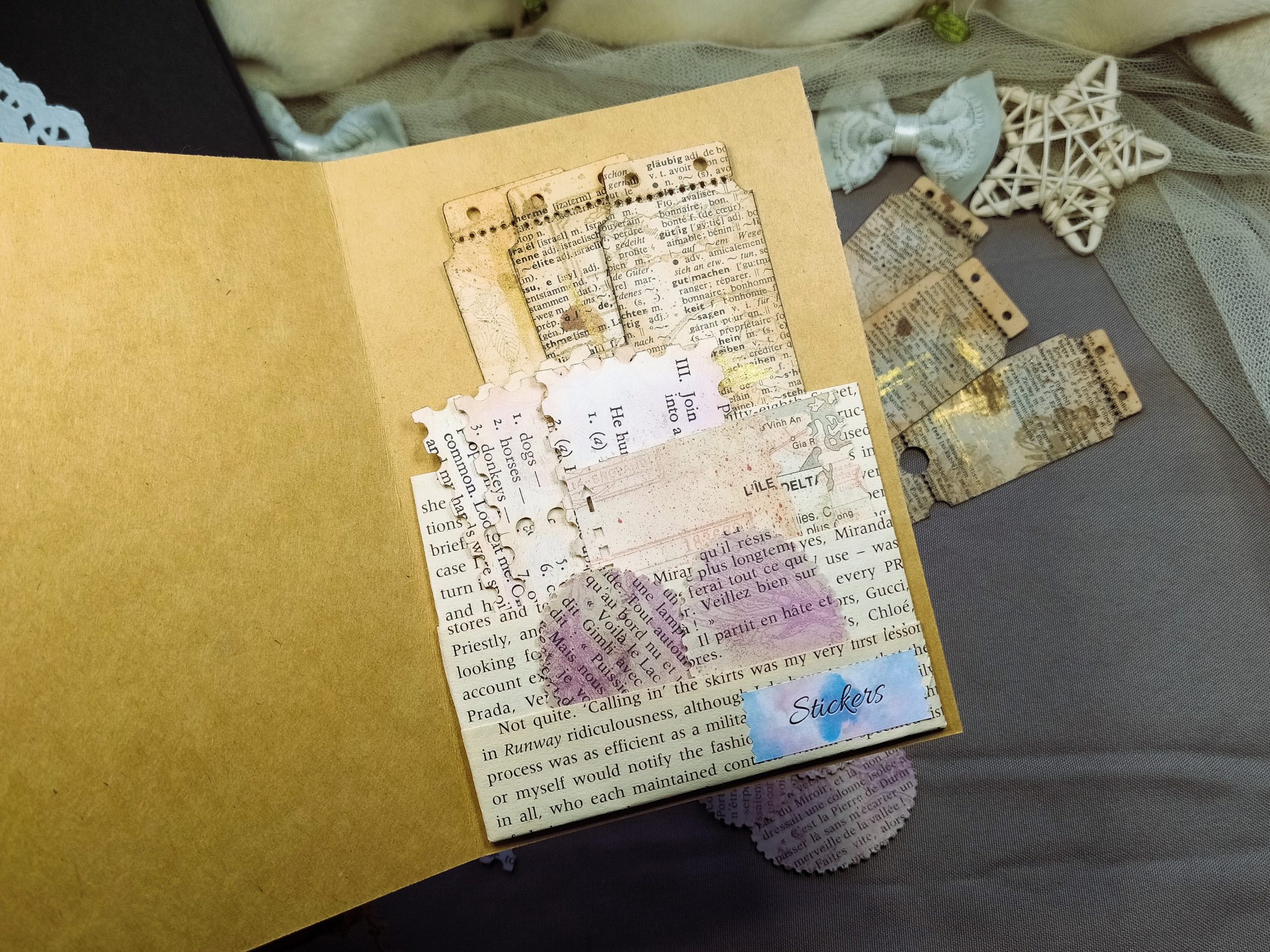 Chaque morceau de papier est d’abord vieilli et patiné à la main à l’aide d’encres colorées, puis décoré avec de délicats tamponnages afin de renforcer son aspect retro vintage